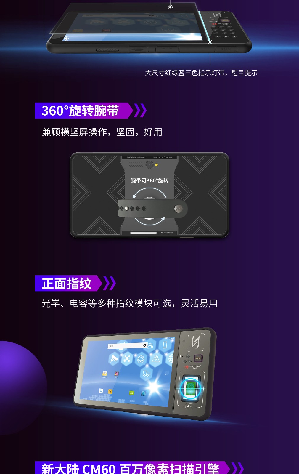 腕帶和指紋識別:平板附帶360°旋轉腕帶,可以實現橫豎屏操作,并具備堅固且易于使用的特點。正面指紋識別功能可實現360°旋轉,提供方便的指紋解鎖方式。此外,平板還支持多種指紋模塊的選配,包括光學、電容等。